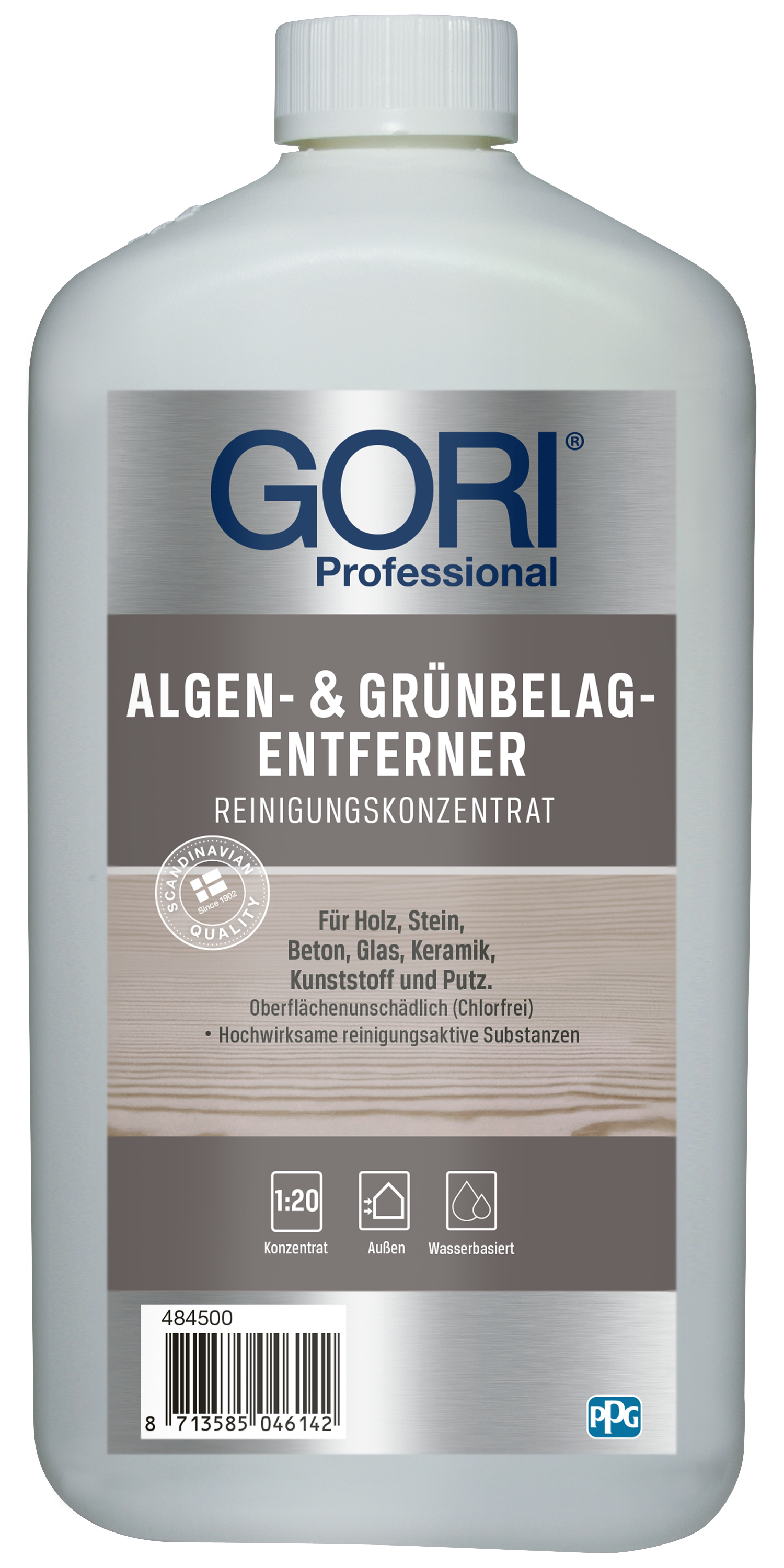 GORI Algen- und Grünbelag Entferner ist ein hochwirksames Reinigungs- und Desinfektionskonzentrat für alle Holz, Stein, Beton, Putz, Keramik und Kunststoffoberflächen im Außenbereich. Algen, Grünbeläge und ähnliche Verunreinigungen werden schnell und einfach entfernt.